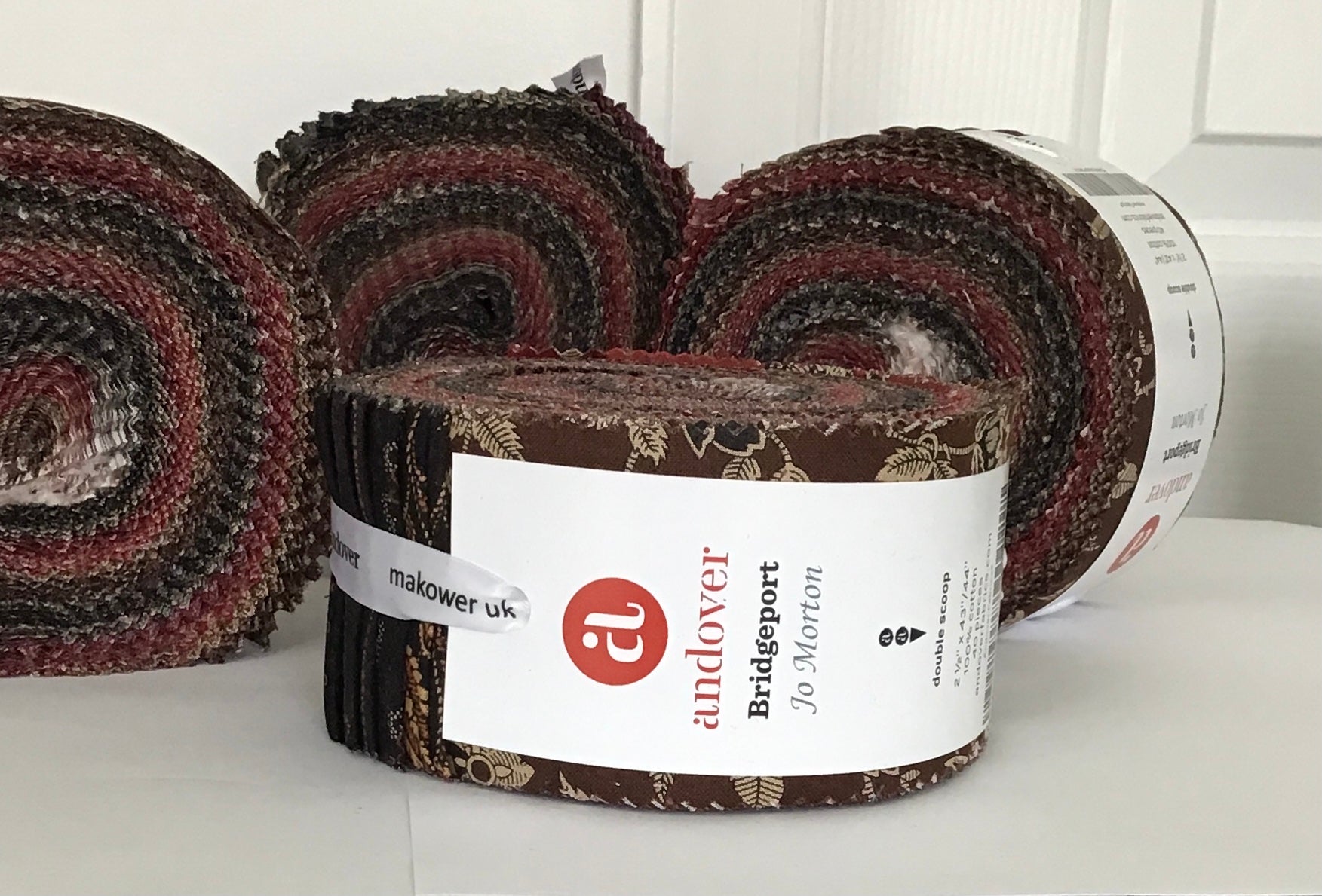 Bridgeport Fabric Jelly Roll by Jo Morton for Andover Fabrics, (40) 2 1/2" precut cotton quilt strips, (28) beautiful prints. The Bridgeport collection revives some of Jo Morton's most cherished long out-of-print designs. The collection includes deep reds, warm browns and classic black and tan. Prints include floral sprigs, paisley vines, squares and stripes. You will have duplicates of some of the prints.