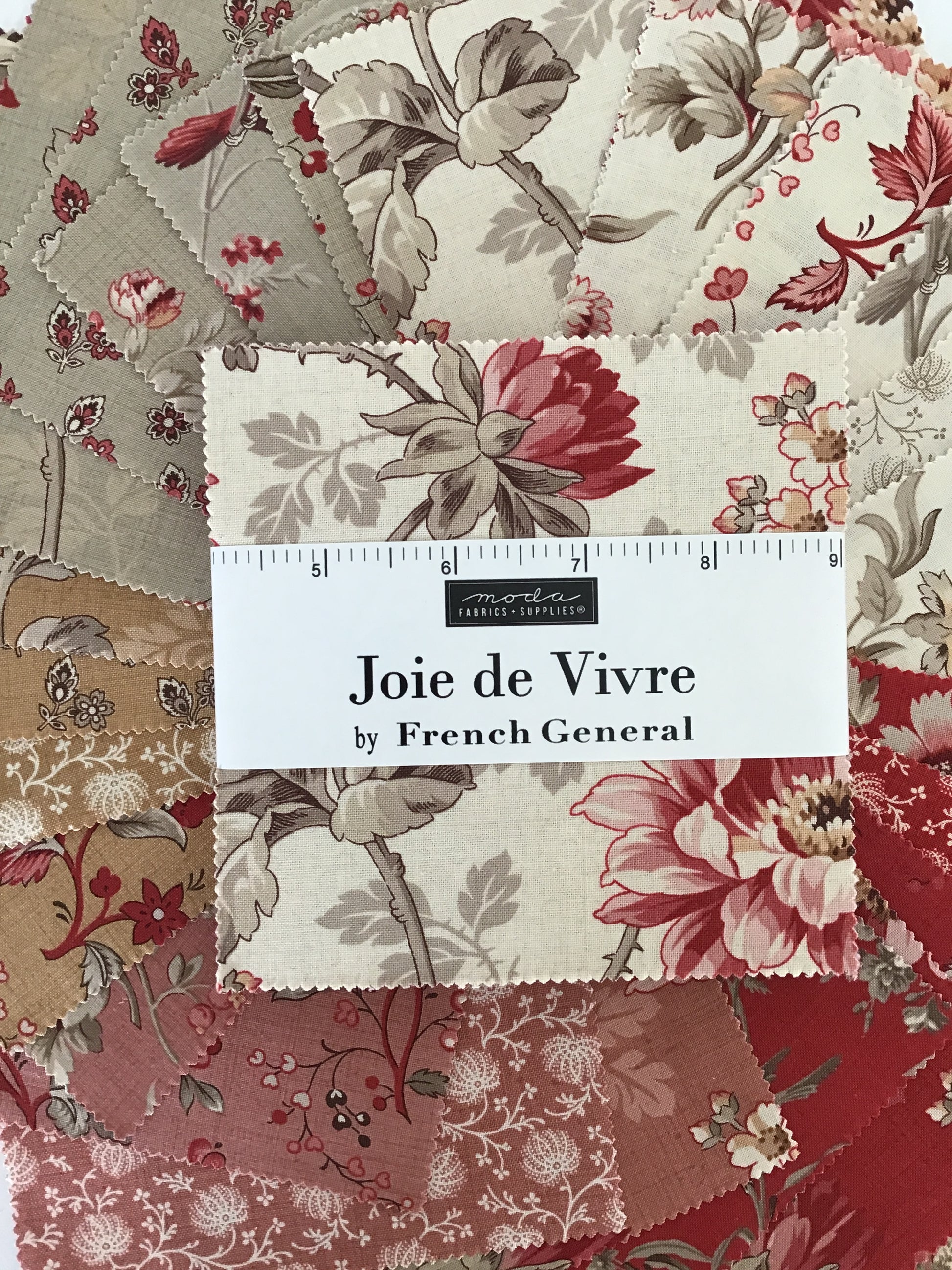 Joie de Vivre Charm Pack by French General for Moda Fabrics, (42) 5" Precut Cotton Quilt Squares. The newest collection from French General is a subtle interpretation of early 19th Century French prints. This is a French General signature palette of pearl, classic French red, tea with golden undertones, clay and cool gray. These floral prints blend well with any of the other French General collections. With (40) different prints you will only have 1 or 2 duplicates.