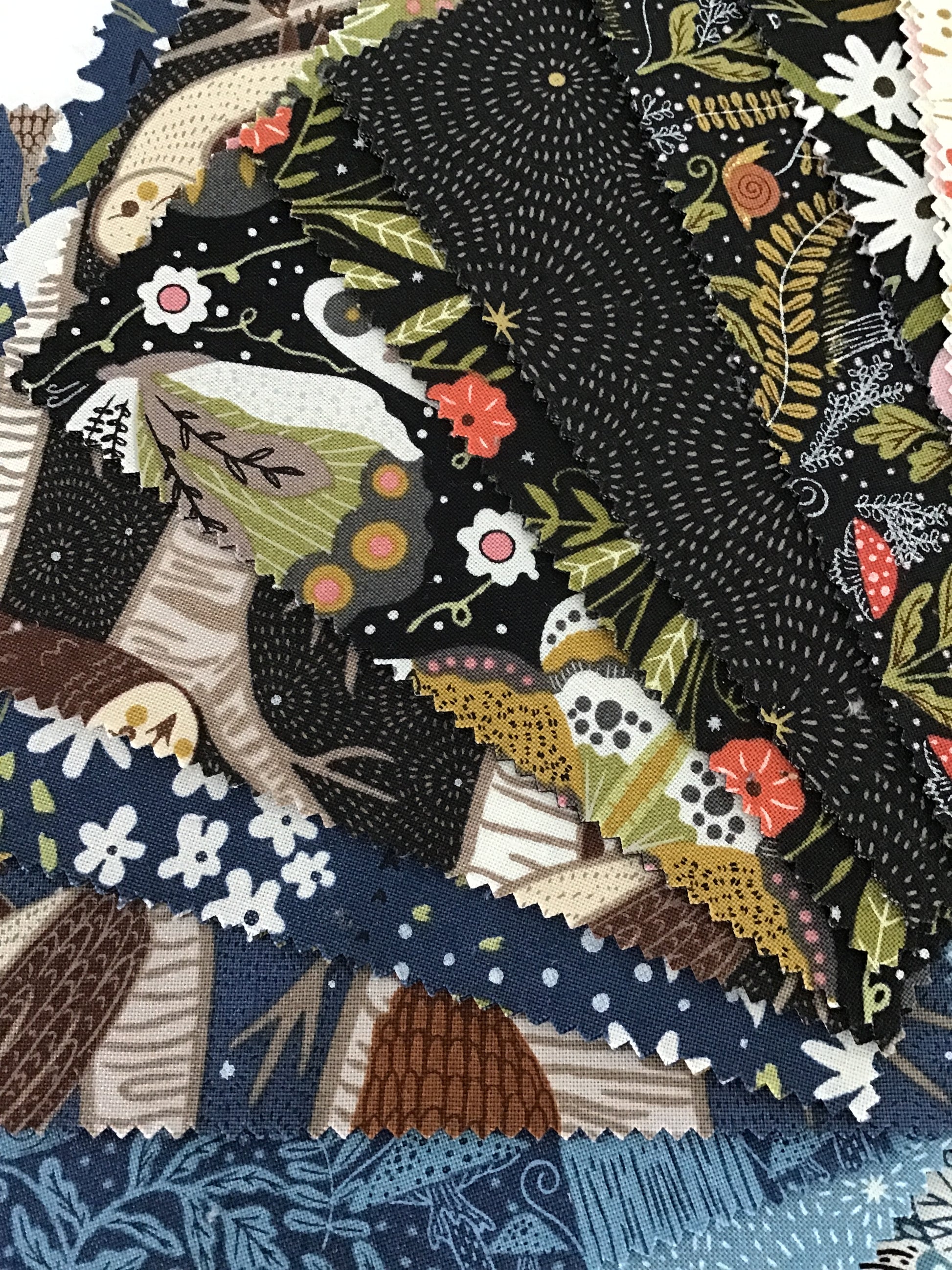 Night Owl Charm Pack by Gingiber for Moda Fabrics, (42) 5" Precut Cotton Quilt Squares, (31) Whimsical Prints. The Night Owl collection is Gingiber's world of the forest after dark. These whimsical prints contain silhouettes of owls, mushrooms and lush textures of midnight blues, mossy greens, earthy browns, and a glimmer of soft silver. With (31) different prints, you will have duplicates of some of the prints.
