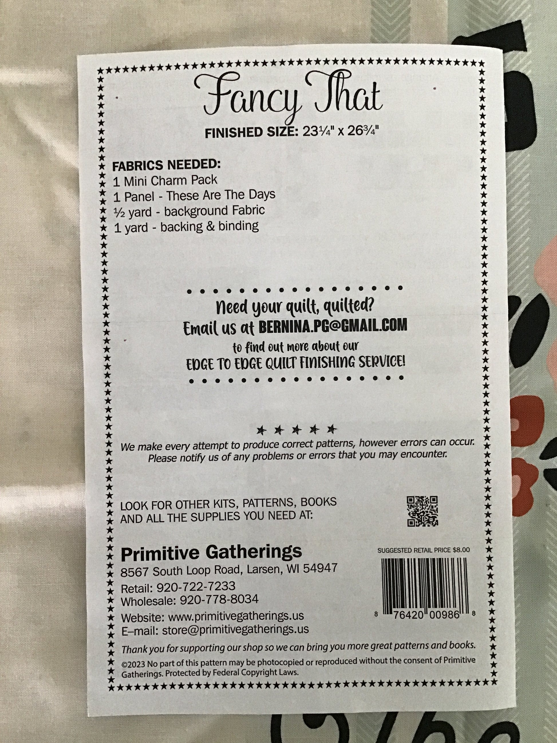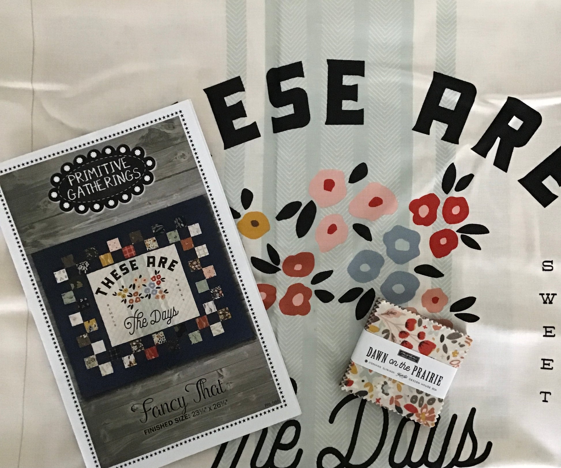 Primitive Gatherings Fancy That Quilt Kit, Mini Charm Pack & Panel Included. Panel is from Dawn on the Prairie by Fancy That Design House. It is one yard of fabric that can be fussy cut for patchwork, creating pillows or adding a statement backing to your quilt. Also included is one Dawn on the Prairie Mini Charm Pack. Background, backing and binding fabric not included. Finished size is approximately 23 1/4" x 26 3/4". Great gift idea.